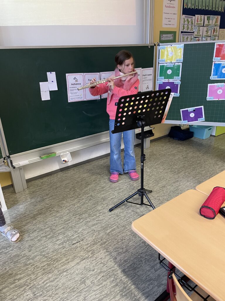 Eigenverantwortlich brachten sie ihre Instrumente von zu Hause mit und spielten weihnachtliche und adventliche Lieder vor. Trotz der krankheitsbedingt etwas kleineren Klassengemeinschaft wurde das Klassenzimmer von warmen Klängen und fröhlichen Gesichtern erfüllt. Die Zuhörerinnen und Zuhörer lauschten aufmerksam und genossen den kleinen musikalischen Auftritt sehr.